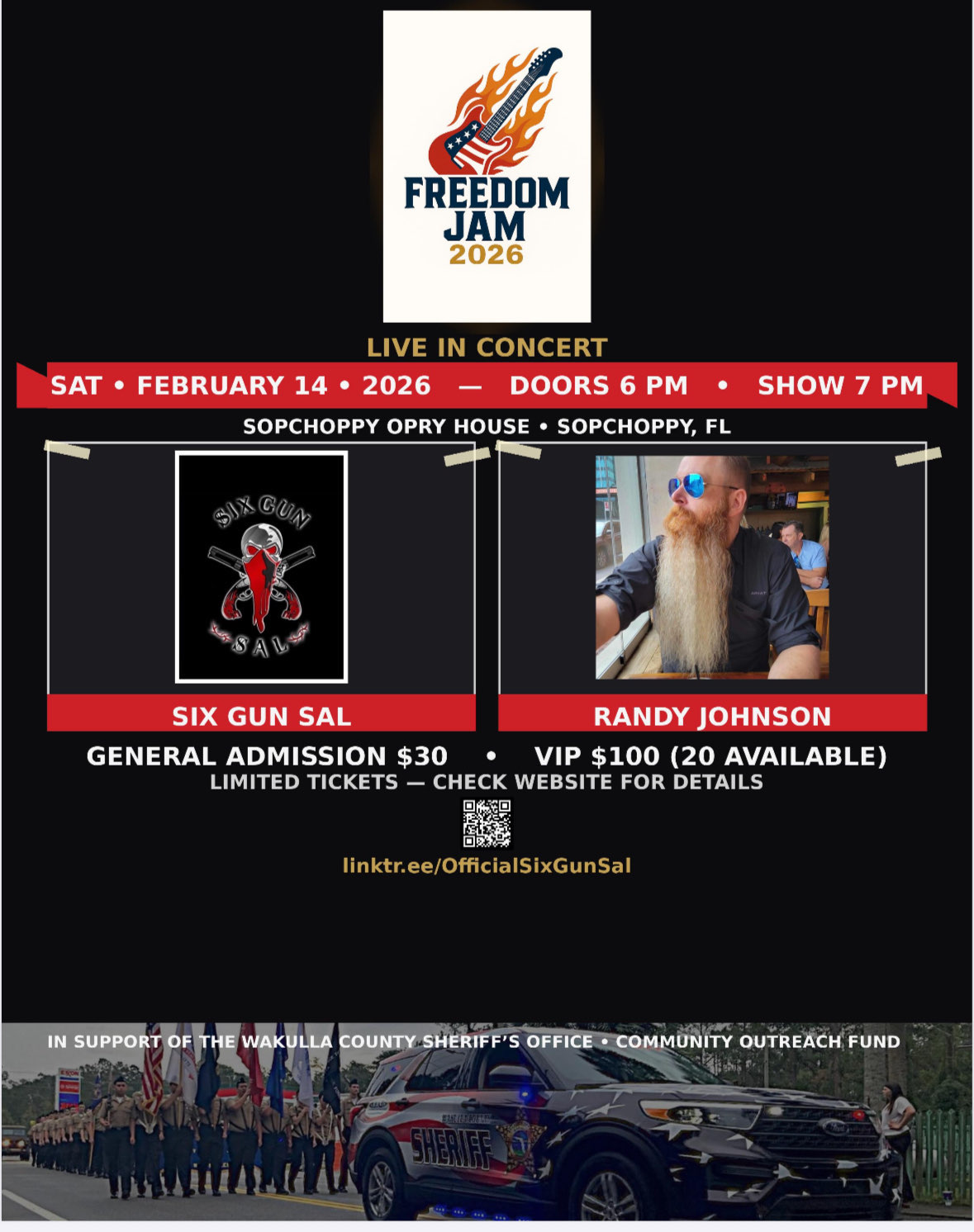 SOPCHOPPY OPRY HOUSE 164 YELLOW JACKET ROAD, Sopchoppy, FL, United StatesRANDY JOHNSON OPENS FOR SIX GUN SAL MUSIC EVENT TO RAISE MONEY FOR WAKULLA COUNTY SHERIFF’S OFFICE The proceeds raised through fundraising efforts and community donations support the Wakulla County Sheriff’s Office Community Outreach Fund, which benefits a variety of important local initiatives. Among these is Project Graduation for Wakulla County’s graduating seniors — a […]